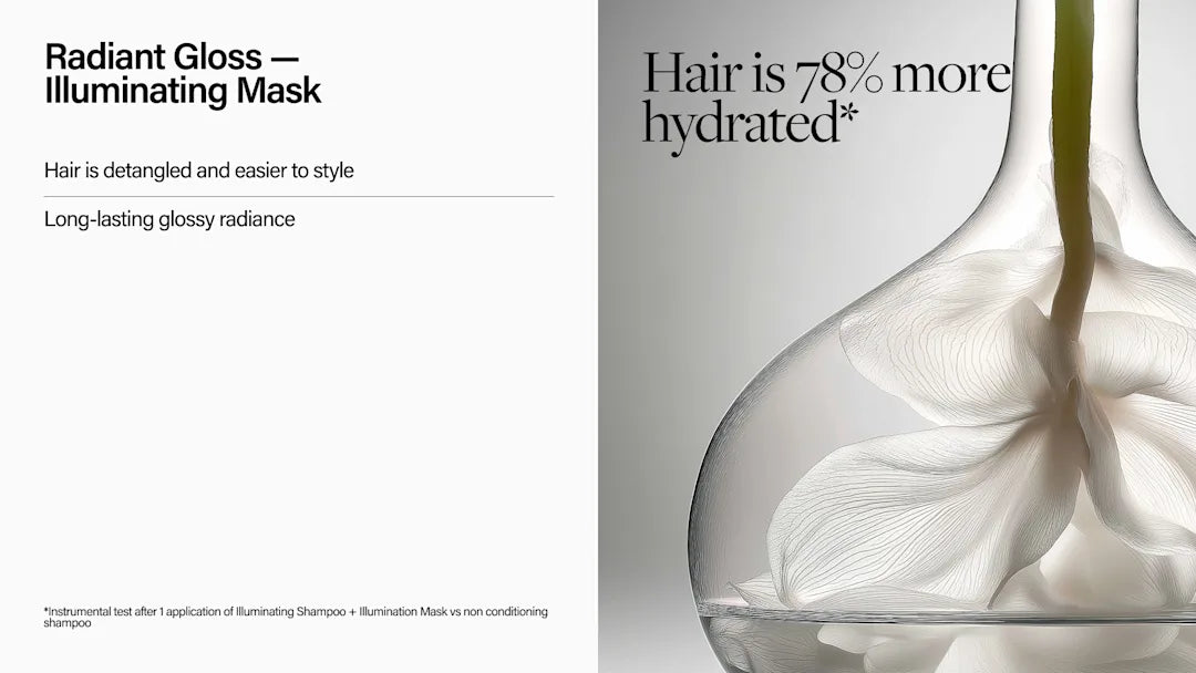 ¿Notas tu cabello opaco, apagado o sin vida? Radiant Gloss Illuminating Mask es la mascarilla de acondicionamiento profundo que transforma tu melena en una auténtica seda brillante. Su fórmula avanzada hidrata, repara y recubre la cutícula con lípidos vitales, devolviendo suavidad, vitalidad y un brillo resplandeciente que refleja la luz en cada movimiento.